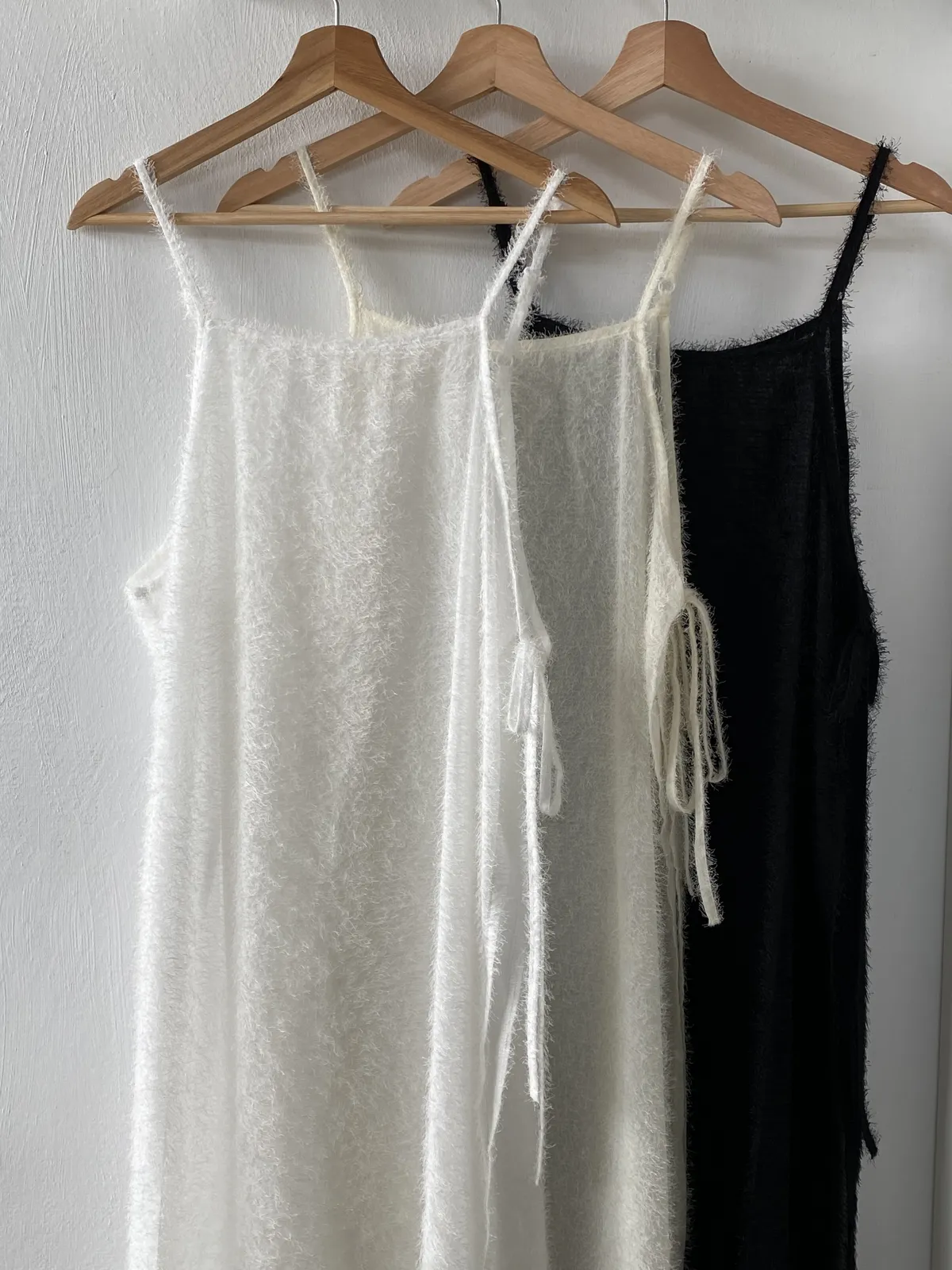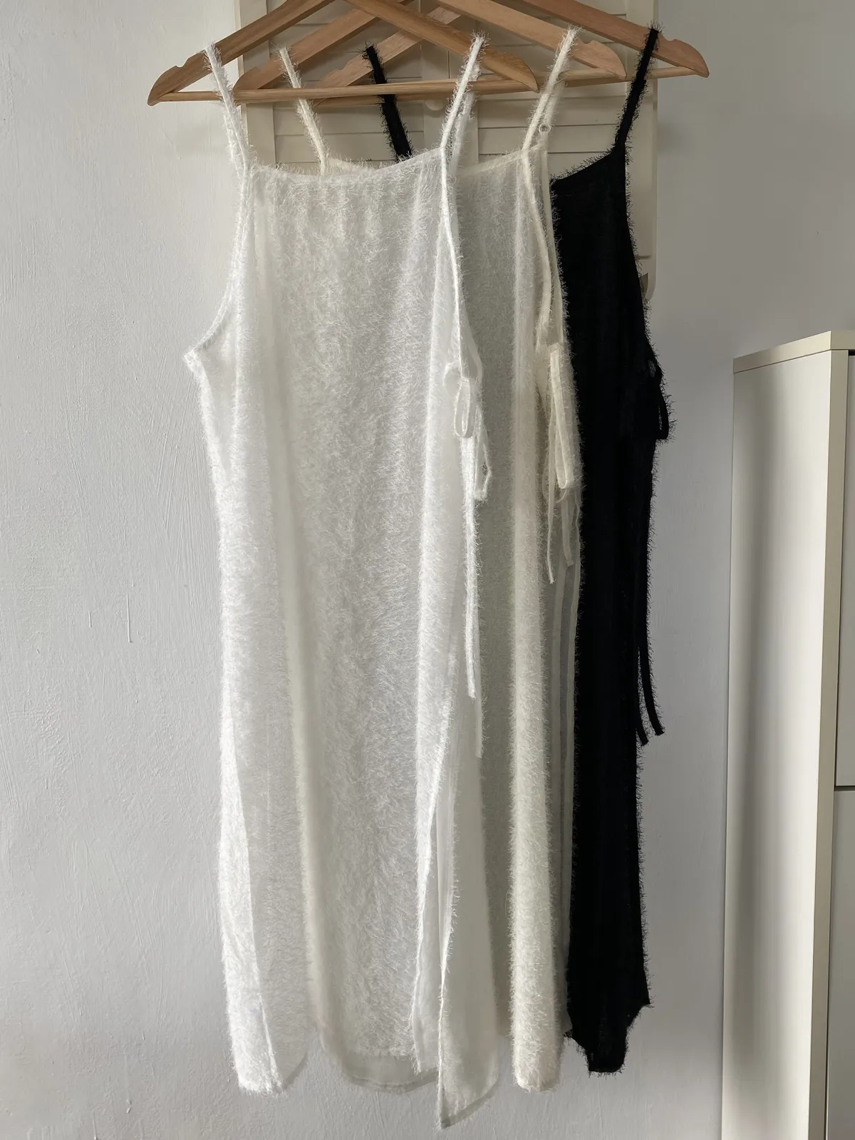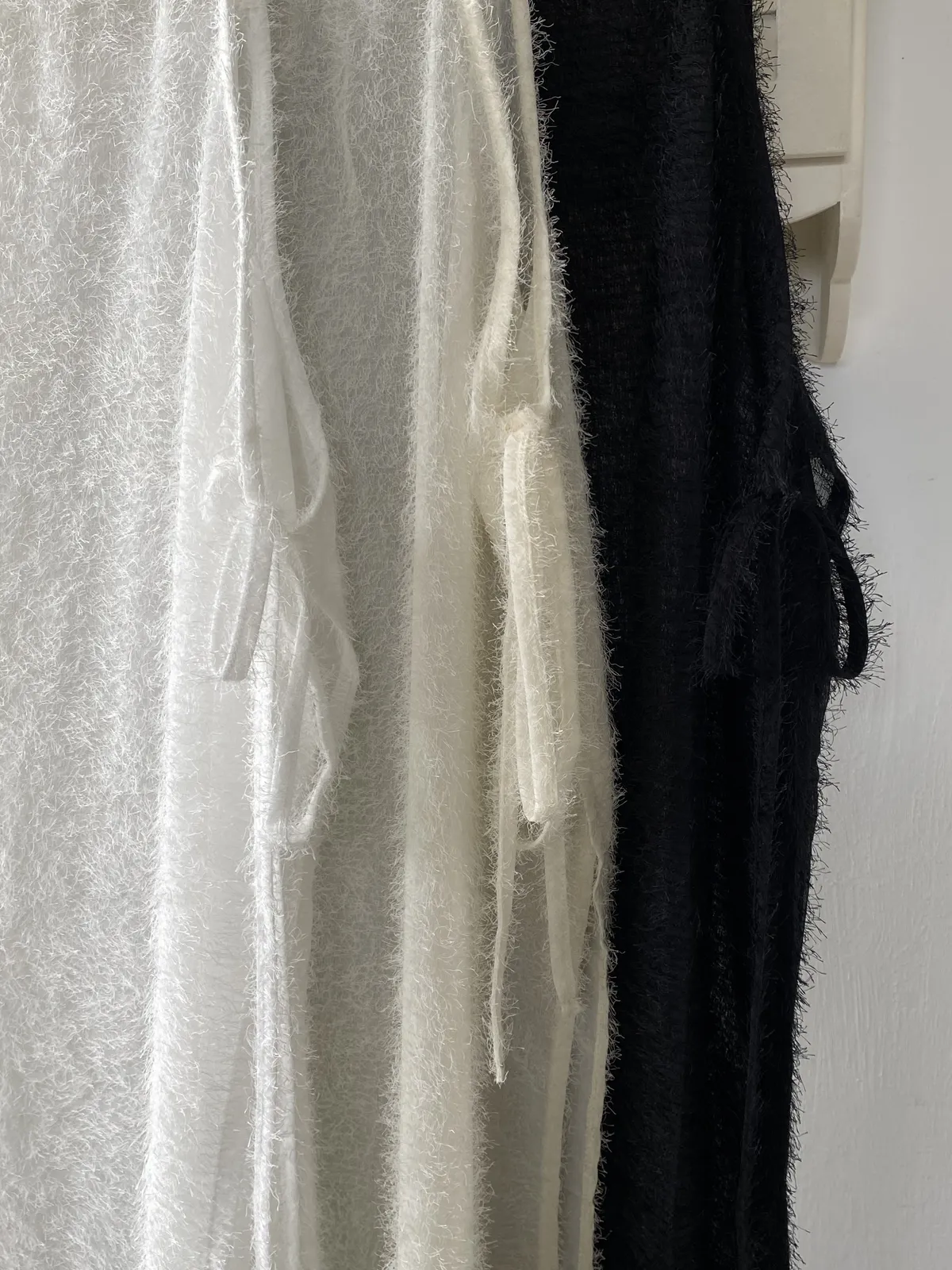 。做單邊側綁帶 有設計感✨。可以讓穿搭很有層次🤩。肩帶可以做調整🔧。毛摸起來舒服!也不會掉毛!。整件帶有透膚感 很輕盈超仙🪽。長版還可以遮肉🥹🫶🏻------Model 163/54腰圍68 臀圍90 大腿圍51現貨1-3天內安排寄出預購7-30天工作天(不含假日)內到貨