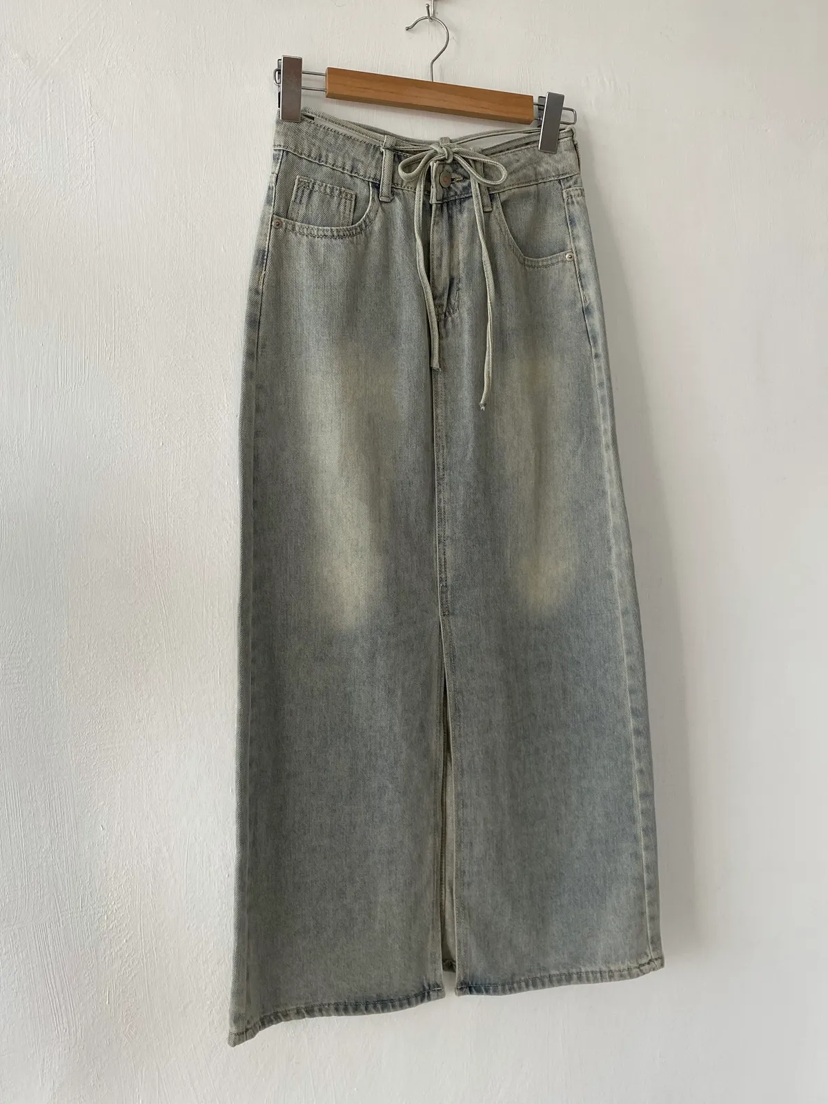 ▻特賣會sale—復古前開衩綁帶牛仔長裙/1 color