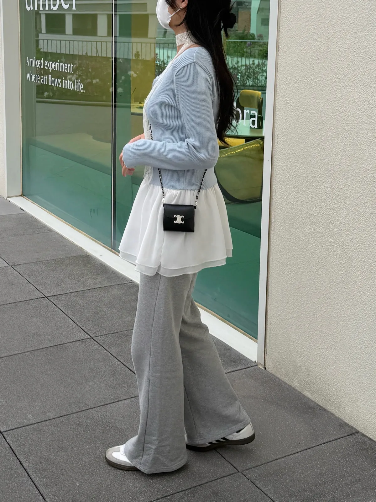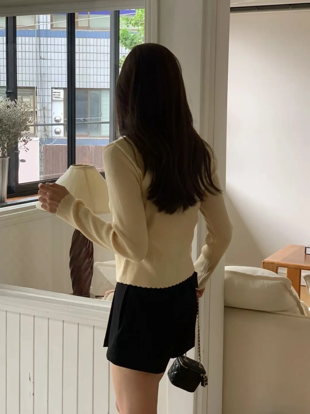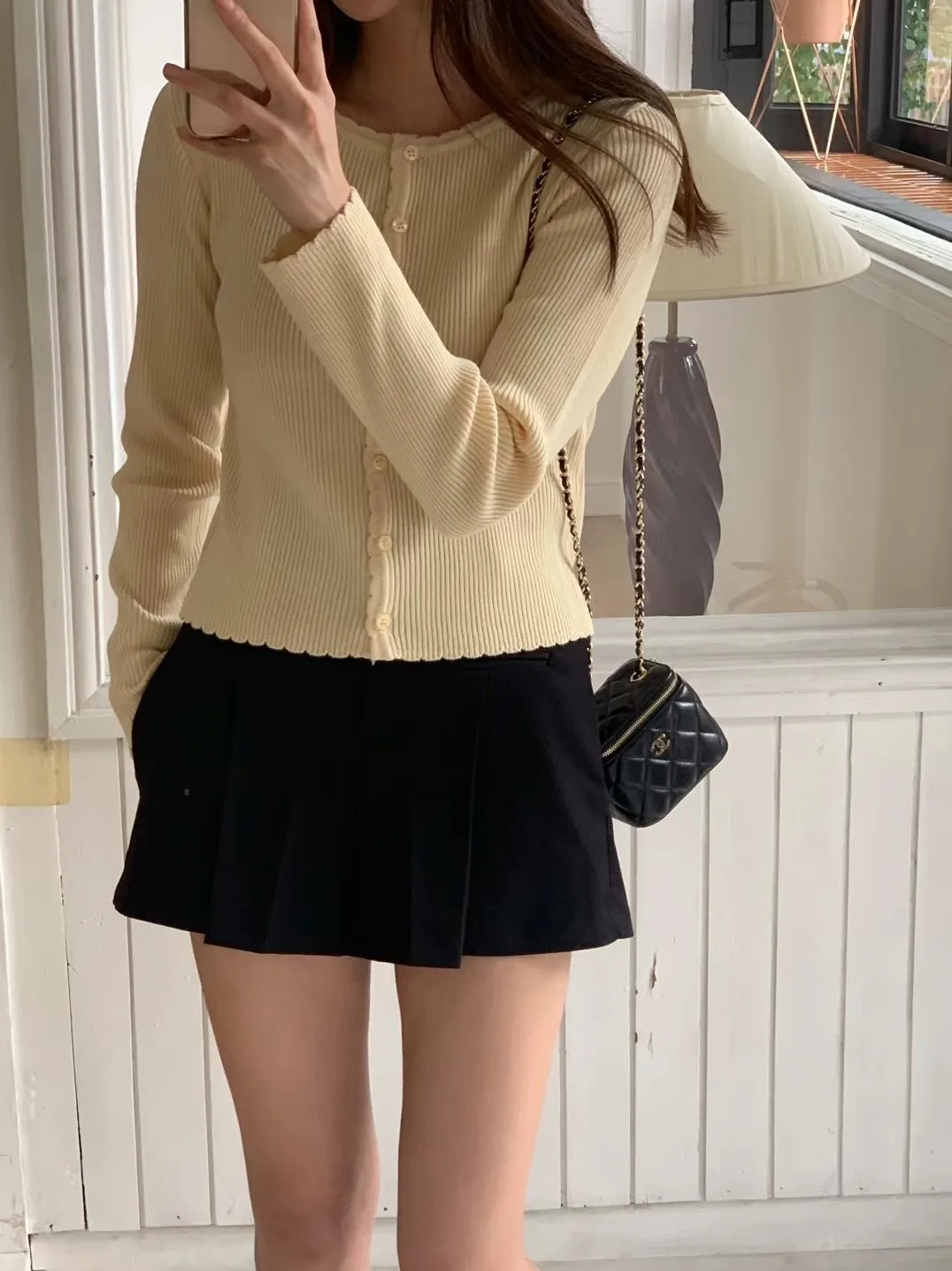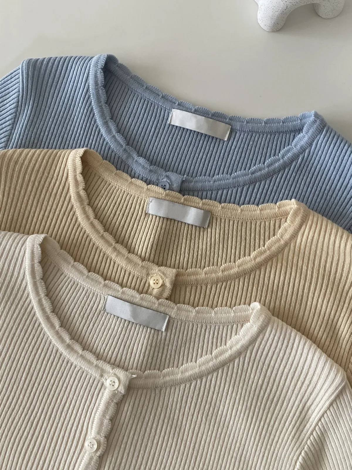 。滾小花邊很可愛🌼。顏色都非常粉嫩又亮✨。排釦設計 可以自行調整。帶有微厚度的針織材質!不單薄!。可當上衣&小外套兩穿~。針織材質不會刺膚---Made in korea---Model 163/54腰圍68 臀圍90 大腿圍51現貨1-3天內安排寄出預購7-30天工作天(不含假日)內到貨