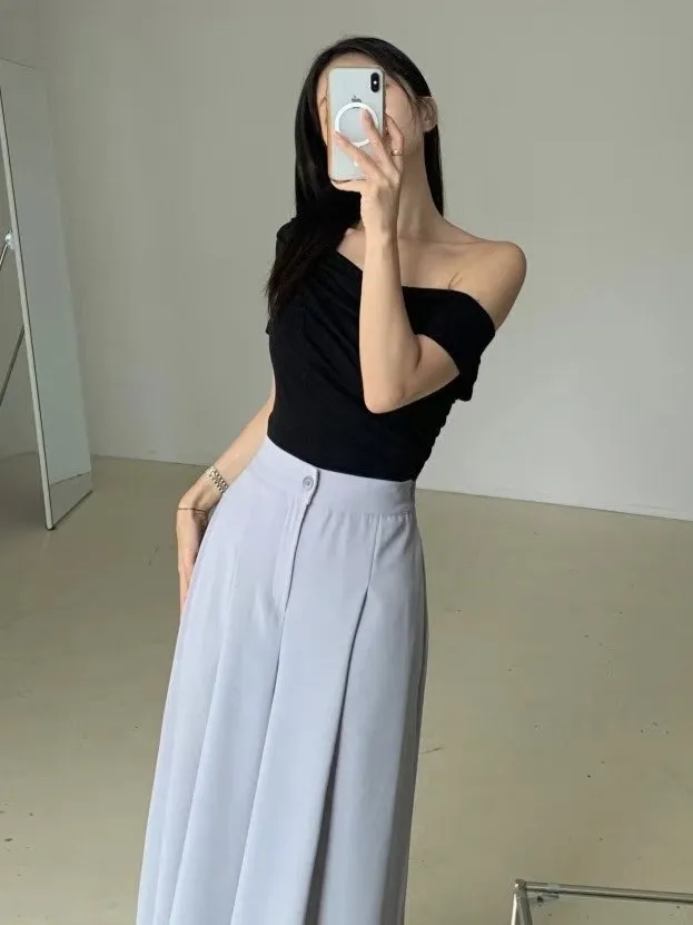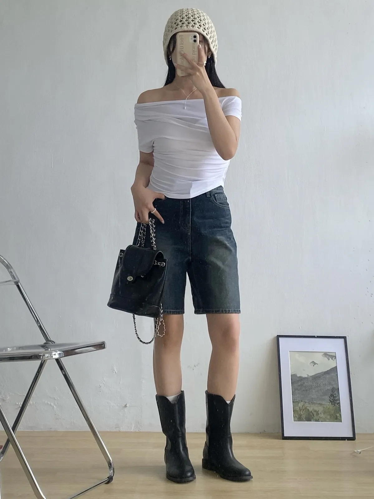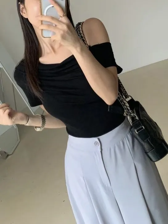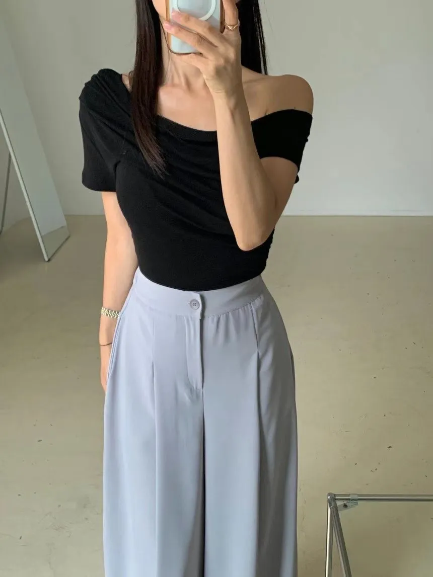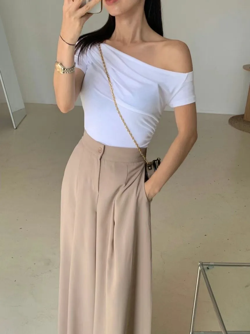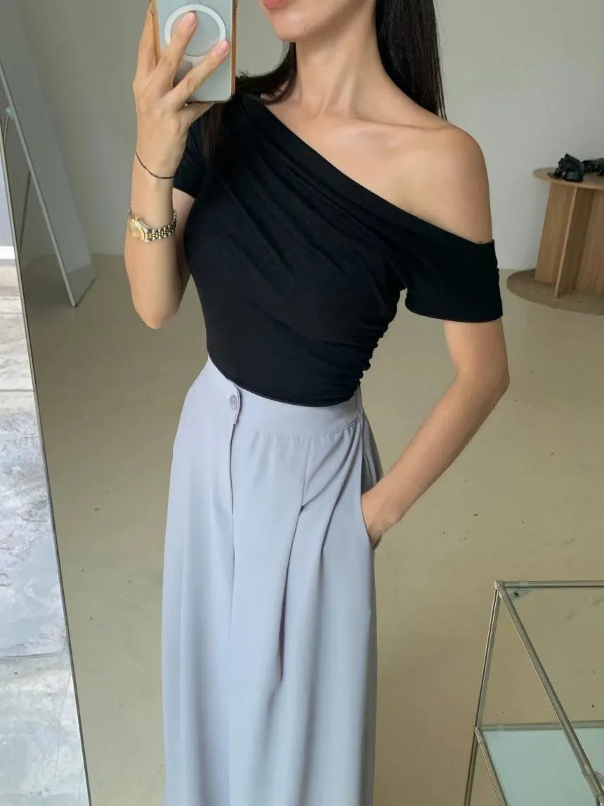 。整件全彈 彈性很好 沒有身材限制~。兩穿法🪽斜肩和拉一字領都可以!。旁邊做抓皺設計 打造腰線感♥️。材質Q彈柔軟☁️。下擺做斜切設計 有造型不無聊。帶點鬆弛慵懶感 穿一件就很有型✨可約會、休閒穿搭---Made in korea---Model 163/54腰圍68 臀圍90 大腿圍51現貨1-3天內安排寄出預購7-30天工作天(不含假日)內到貨