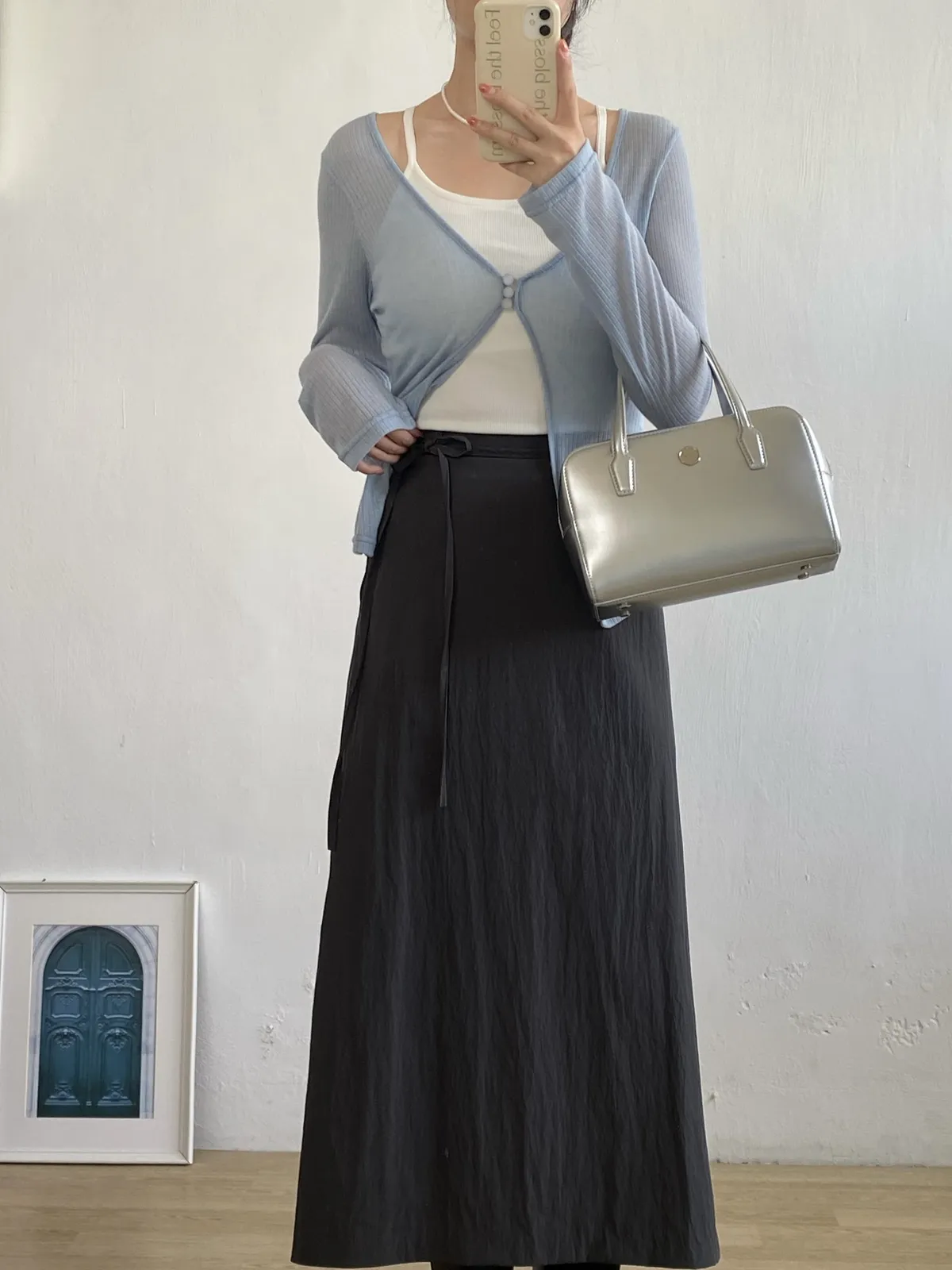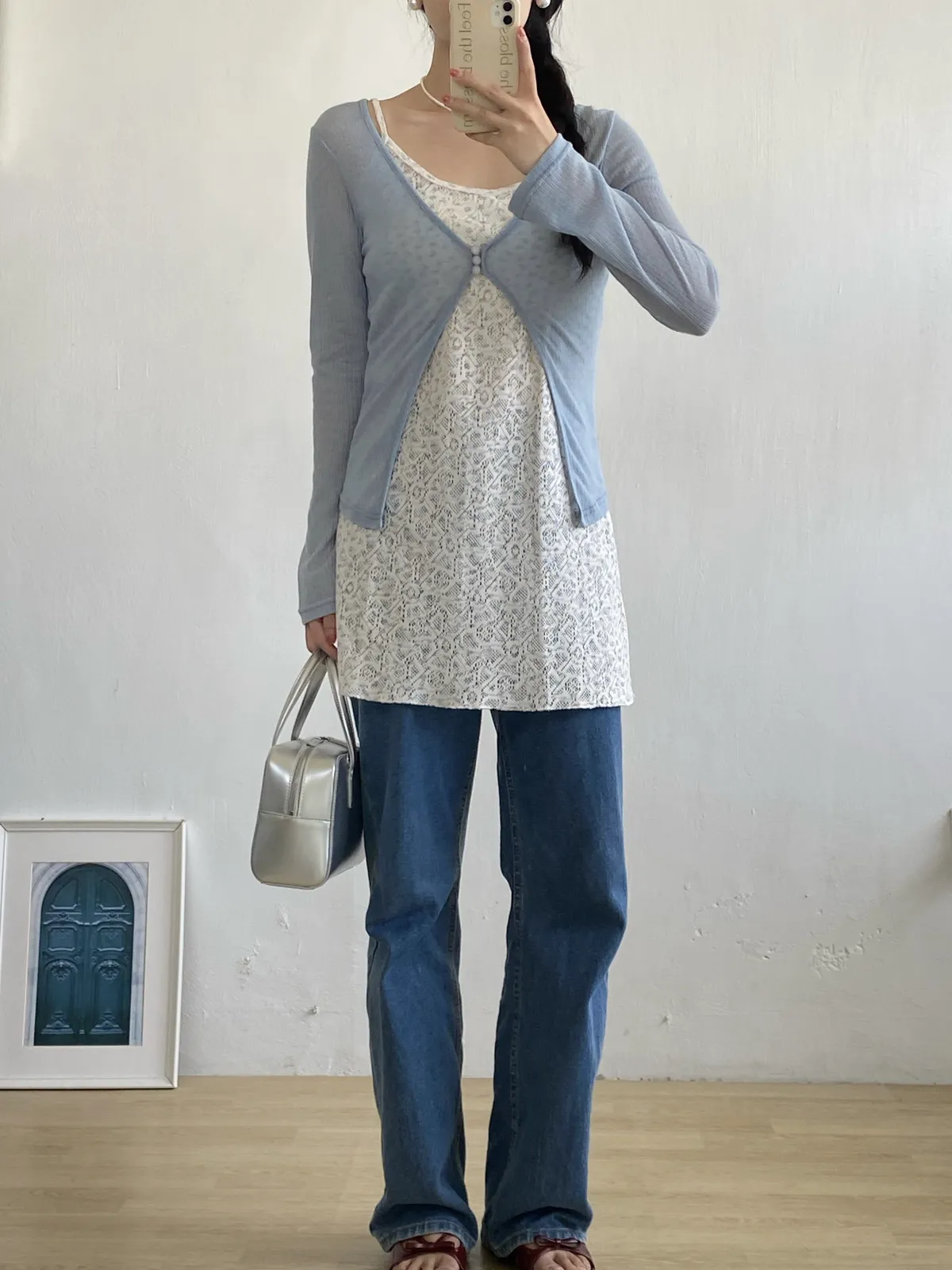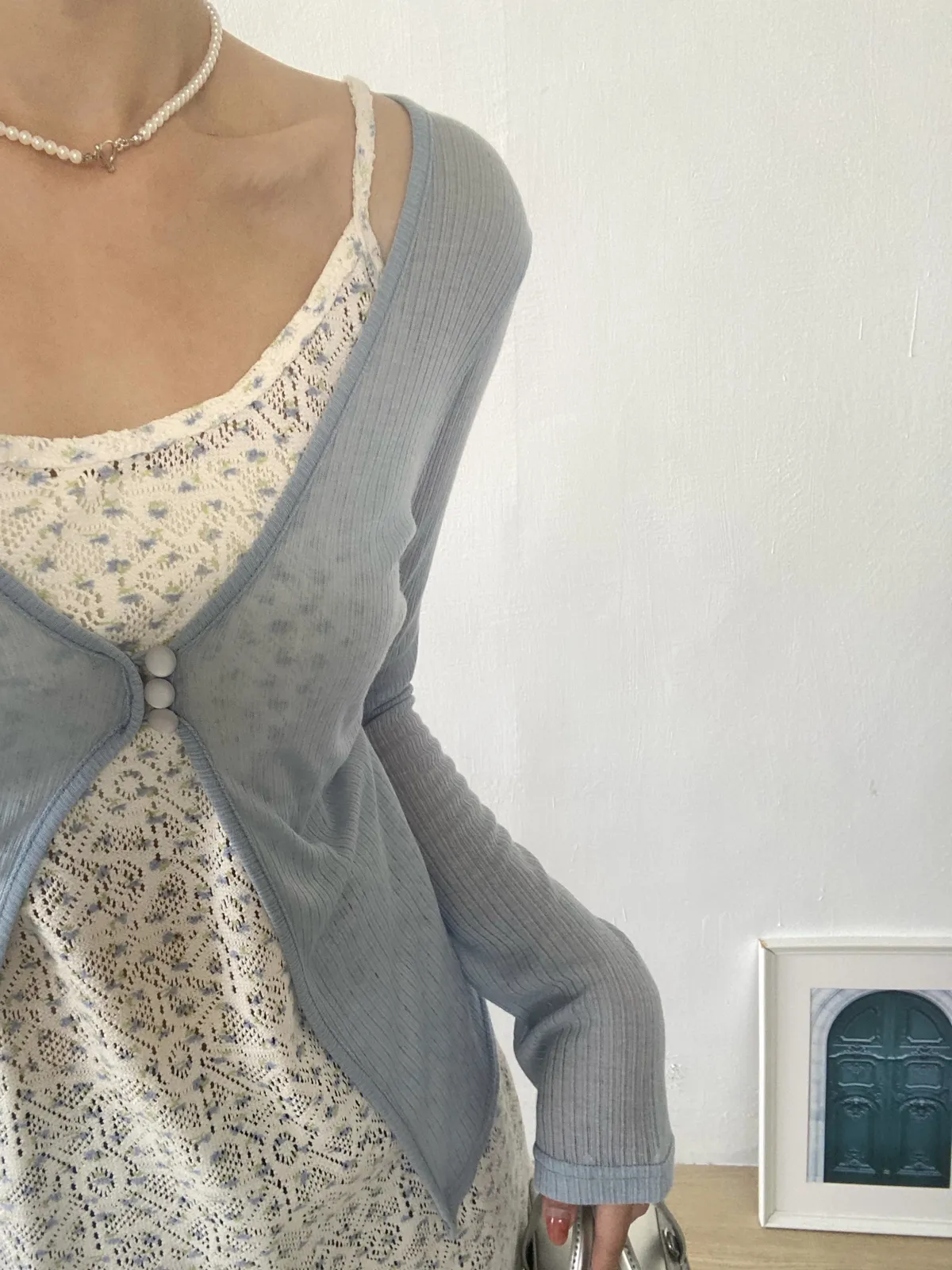 。整件做輕盈透感 很適合春夏🧃。真鈕扣 做霧面玻璃珠感 很漂亮🫧。可以當冷氣房小外套!。不喜歡露手臂女孩必收!!。帶有微彈性 版型屬於剛好合身 但不會緊繃🫶🏻。當小外套做層次感很好看🩵---Made in korea---Model 163/54腰圍68 臀圍90 大腿圍51現貨1-3天內安排寄出預購7-30天工作天(不含假日)內到貨