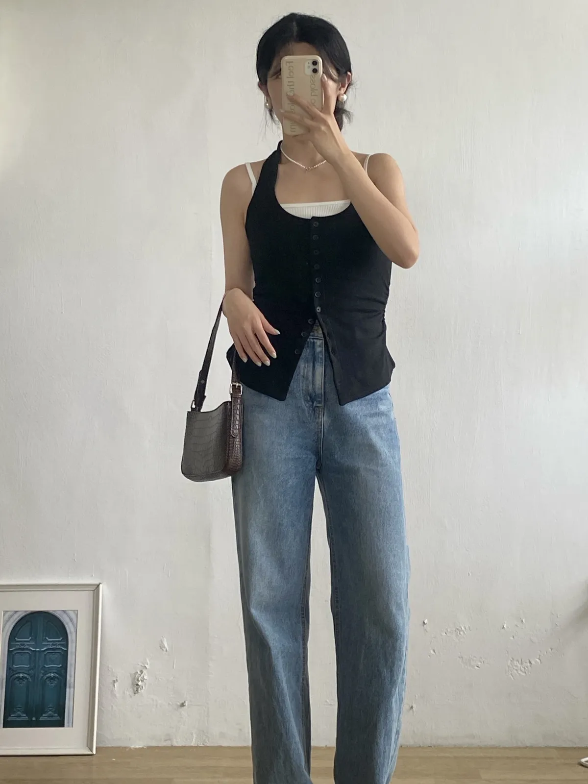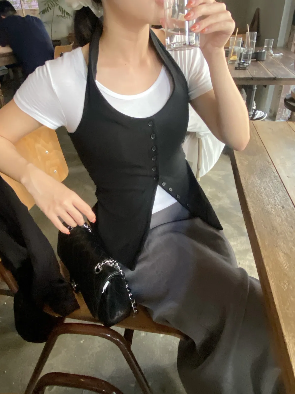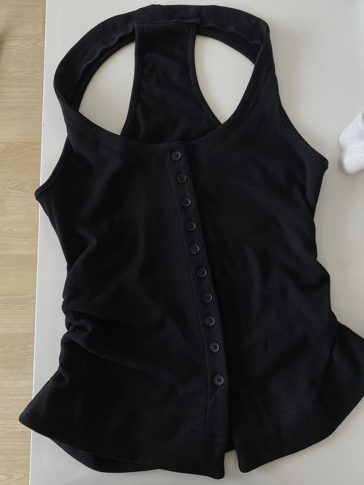 。真排扣 開度可以自行調整🔧。小辣掛脖設計🌶️。側腰還有做抓皺 不怕沒有腰線~。背面做工字美背。不敢單穿 也可以搭配素Tee在裡面!有多種穿法✨材質是有彈性的羅紋🧶------Model 163/54腰圍68 臀圍90 大腿圍51現貨1-3天內安排寄出預購7-30天工作天(不含假日)內到貨