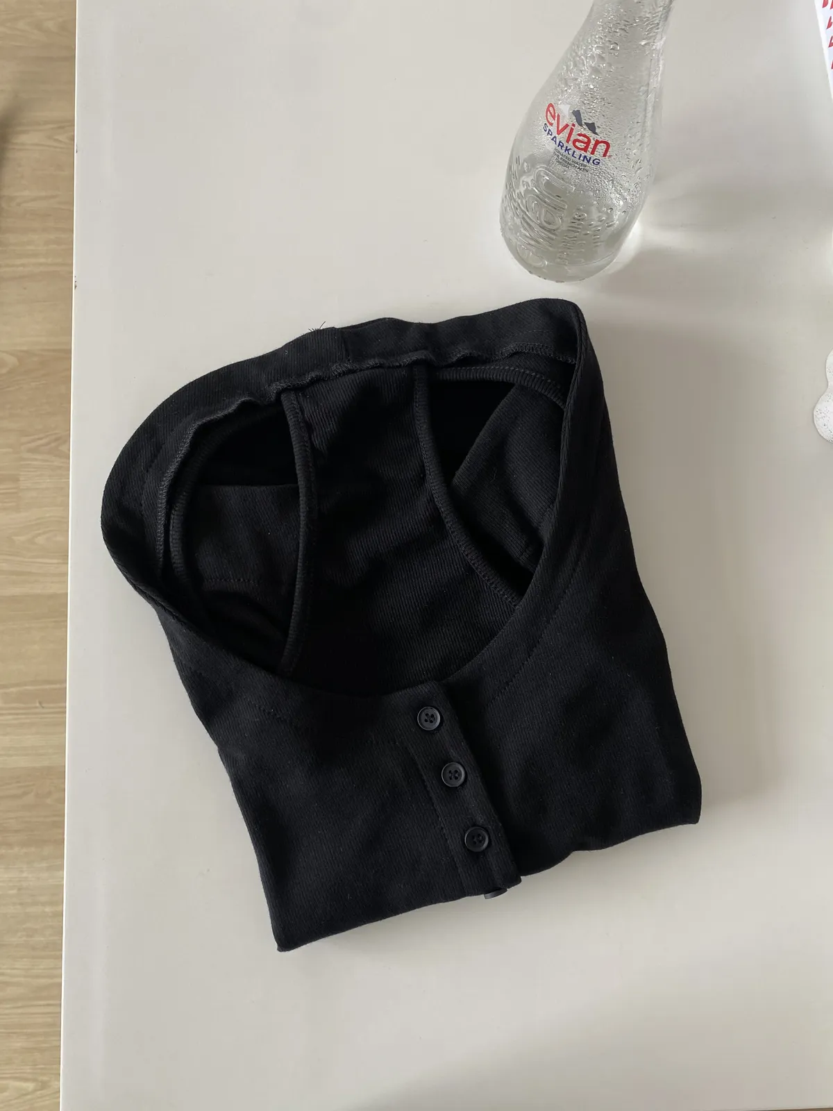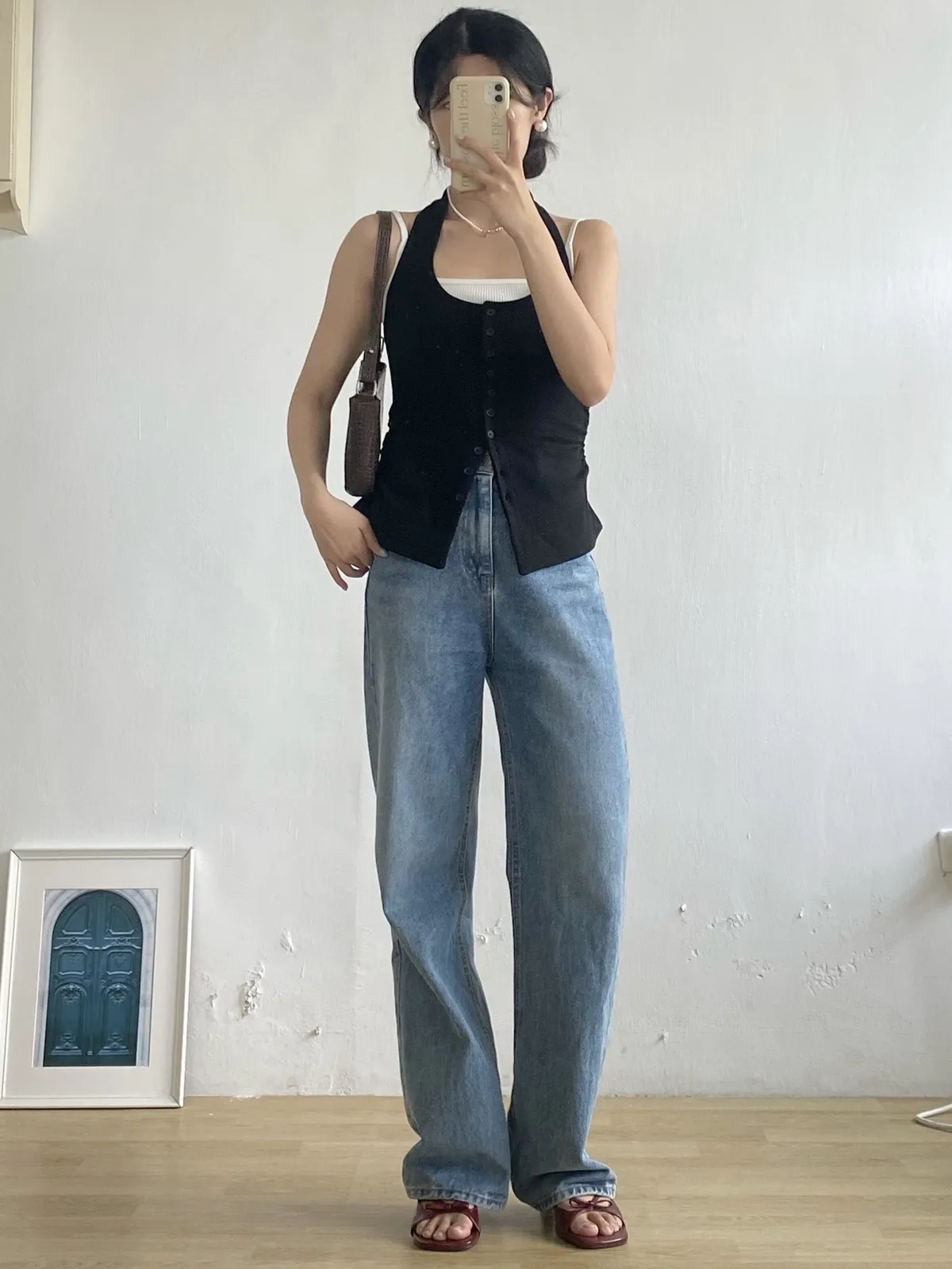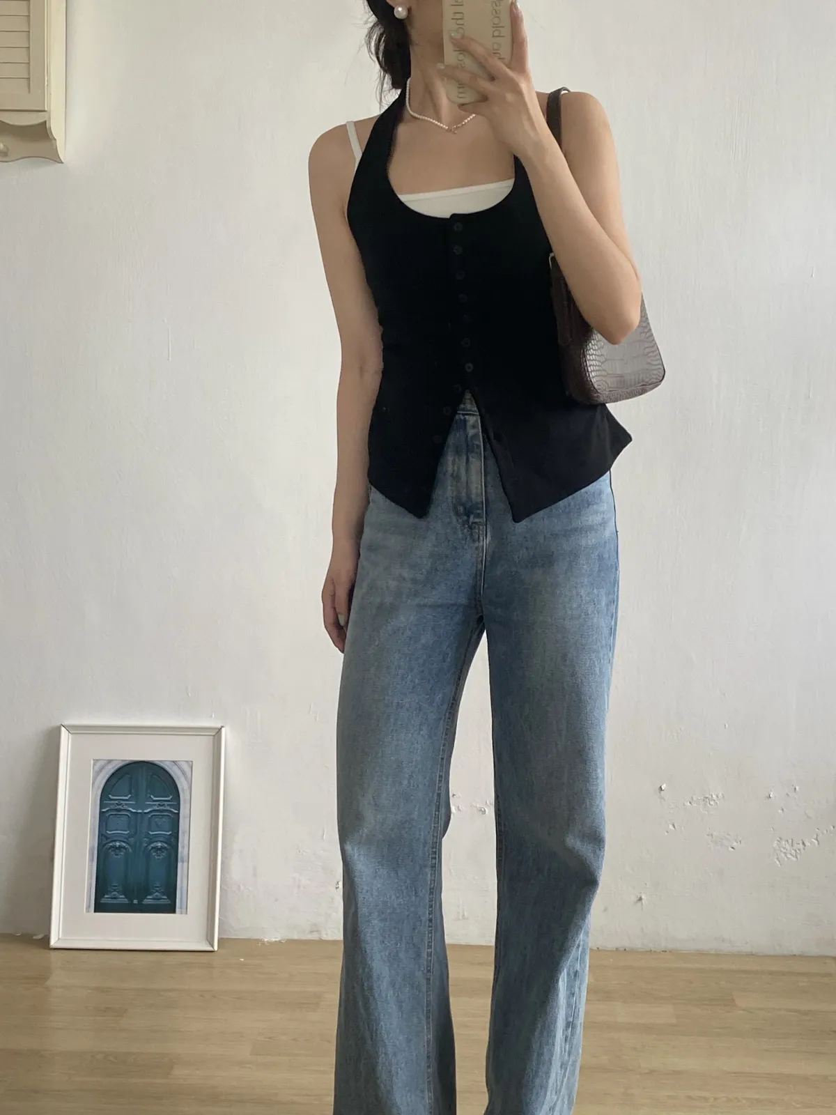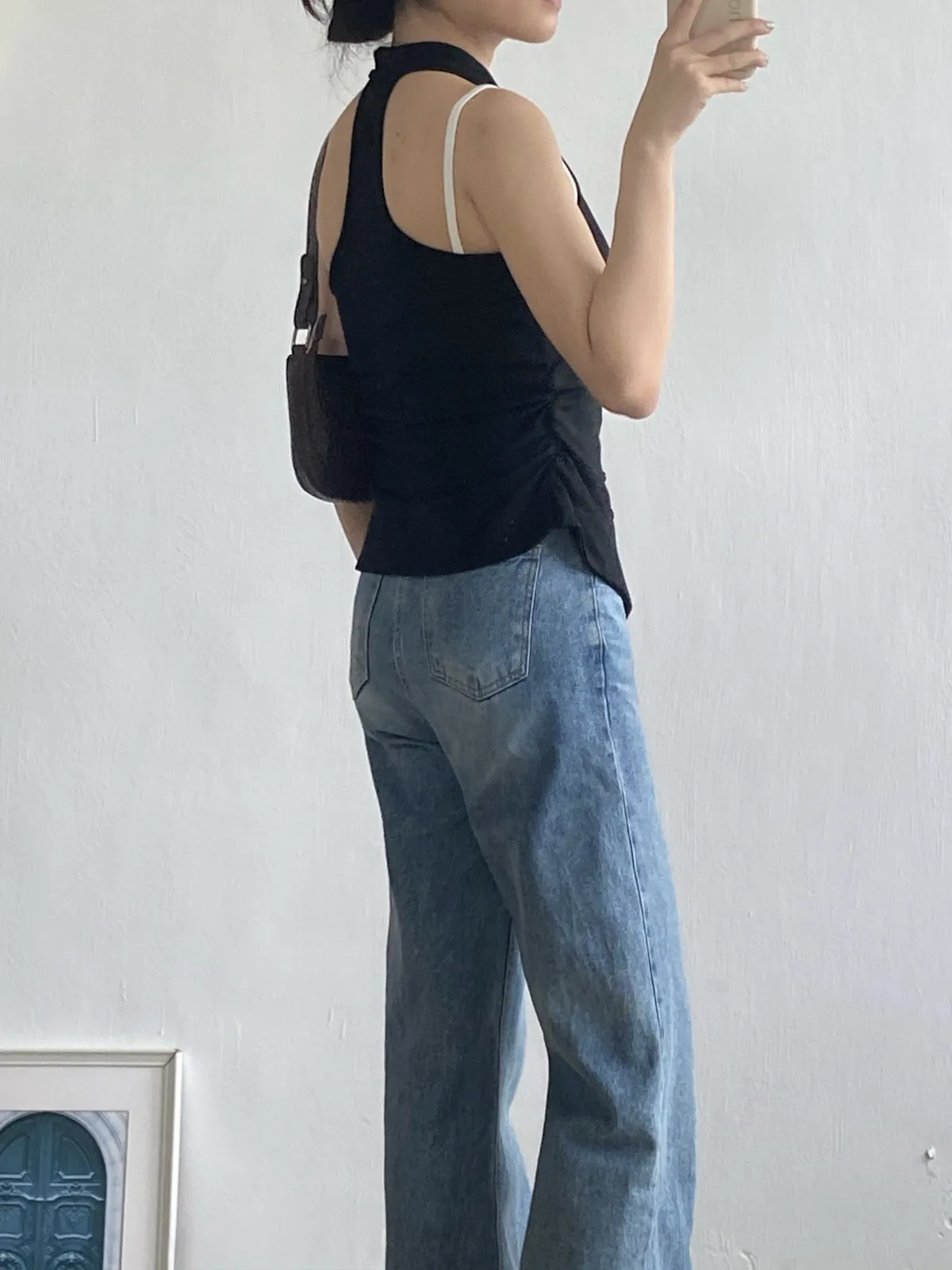 。真排扣 開度可以自行調整🔧。小辣掛脖設計🌶️。側腰還有做抓皺 不怕沒有腰線~。背面做工字美背。不敢單穿 也可以搭配素Tee在裡面!有多種穿法✨材質是有彈性的羅紋🧶------Model 163/54腰圍68 臀圍90 大腿圍51現貨1-3天內安排寄出預購7-30天工作天(不含假日)內到貨