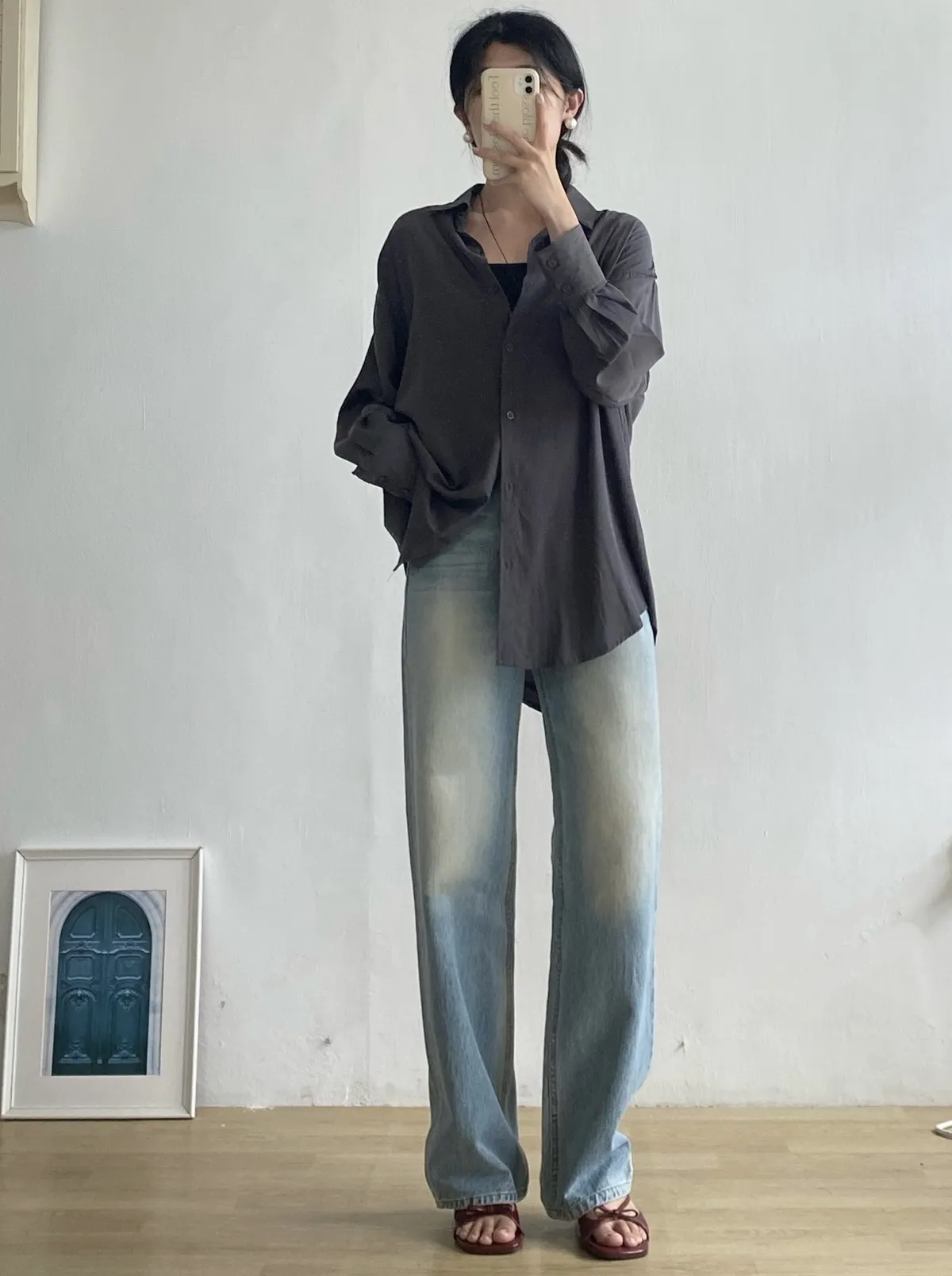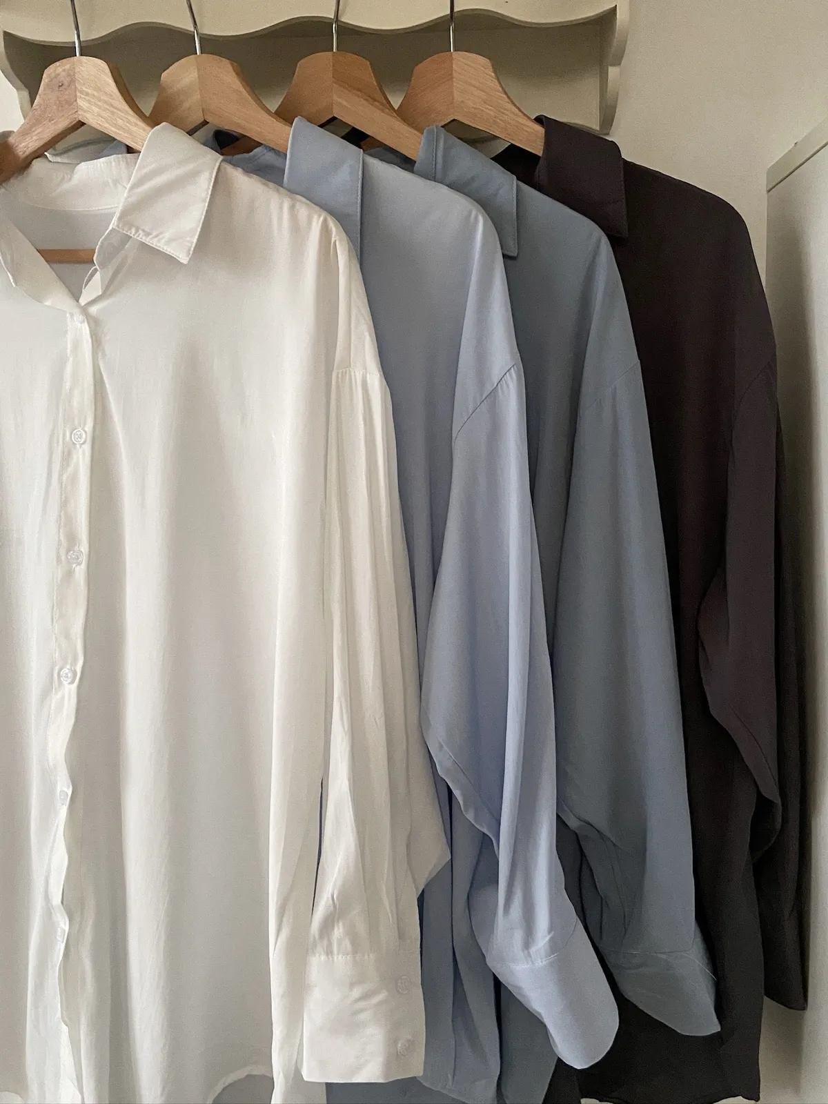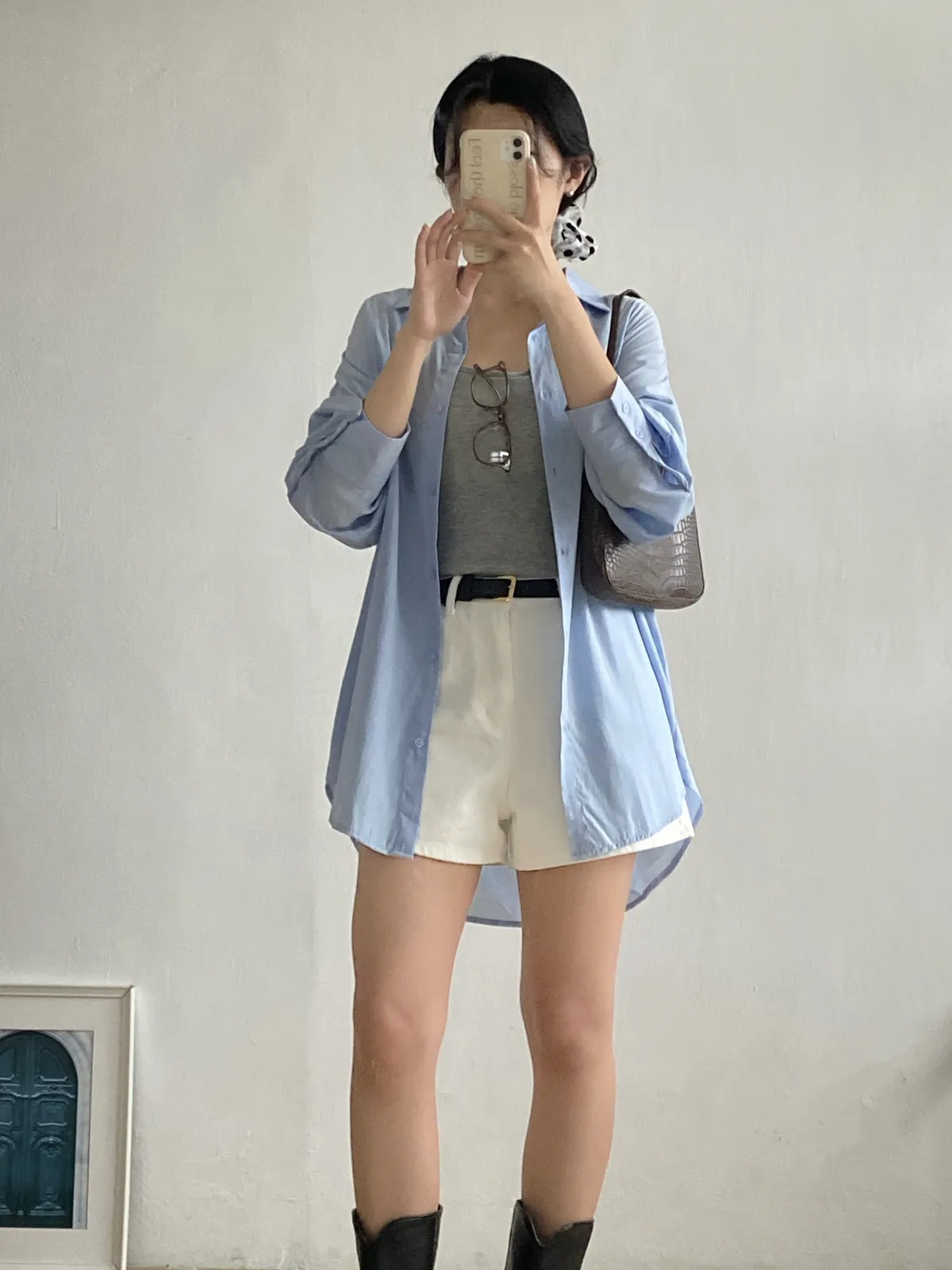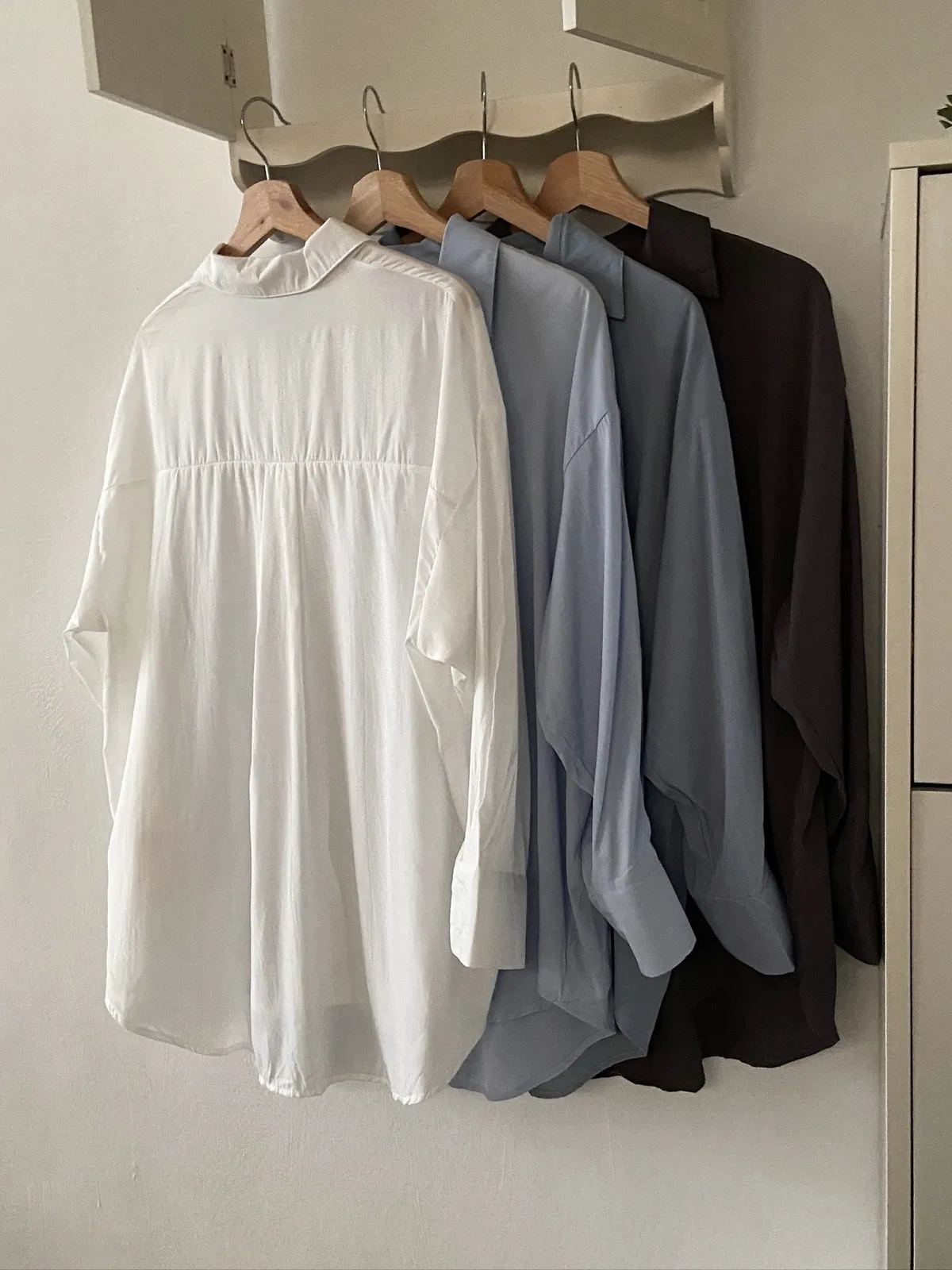 。可以當襯衫上衣、外套兩穿。柔霧藍色系🩵寬鬆版型~。光滑質料很舒服!。很適合春夏 整件輕盈柔和 有慵懶垂墜感🦦。低飽和色調看起來乾淨高級🐚。小個女孩可以當襯衫洋裝高個女孩衣長也不會過短!。長度可以遮屁股 修飾臀胯❣️------ Model 163/54腰圍68 臀圍90 大腿圍51現貨1-3天內安排寄出預購7-30天工作天(不含假日)內到貨