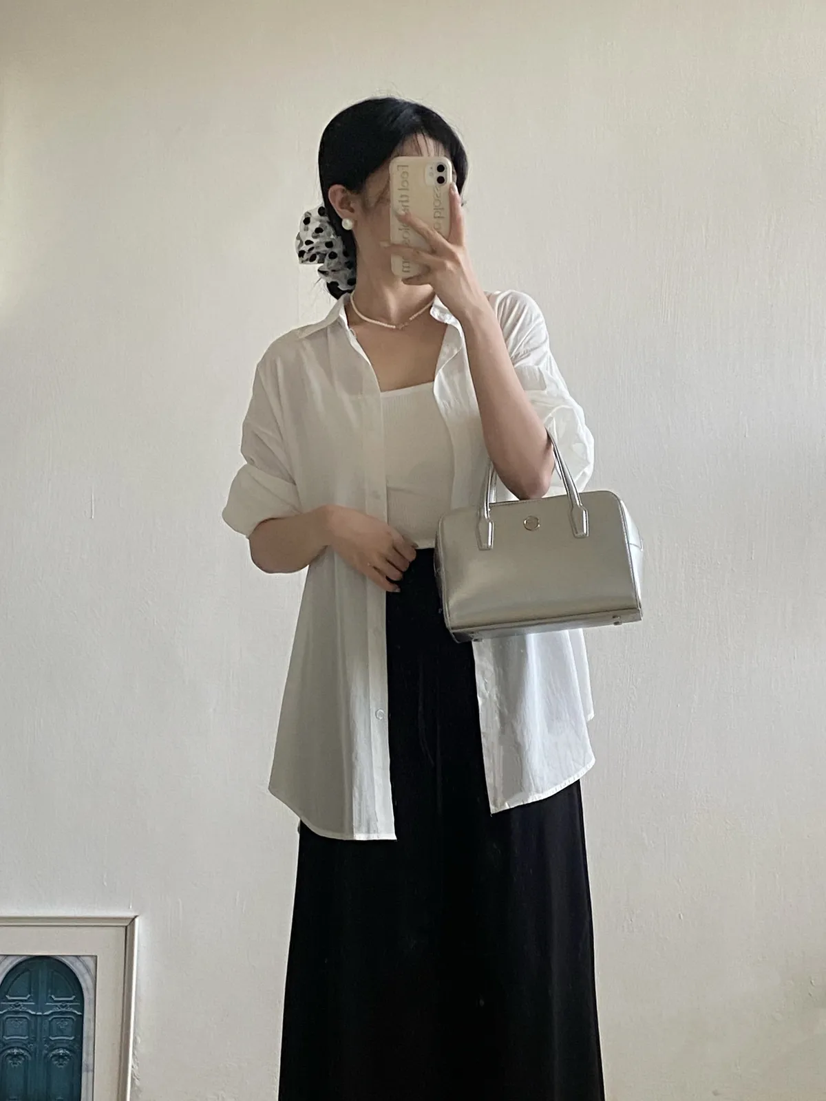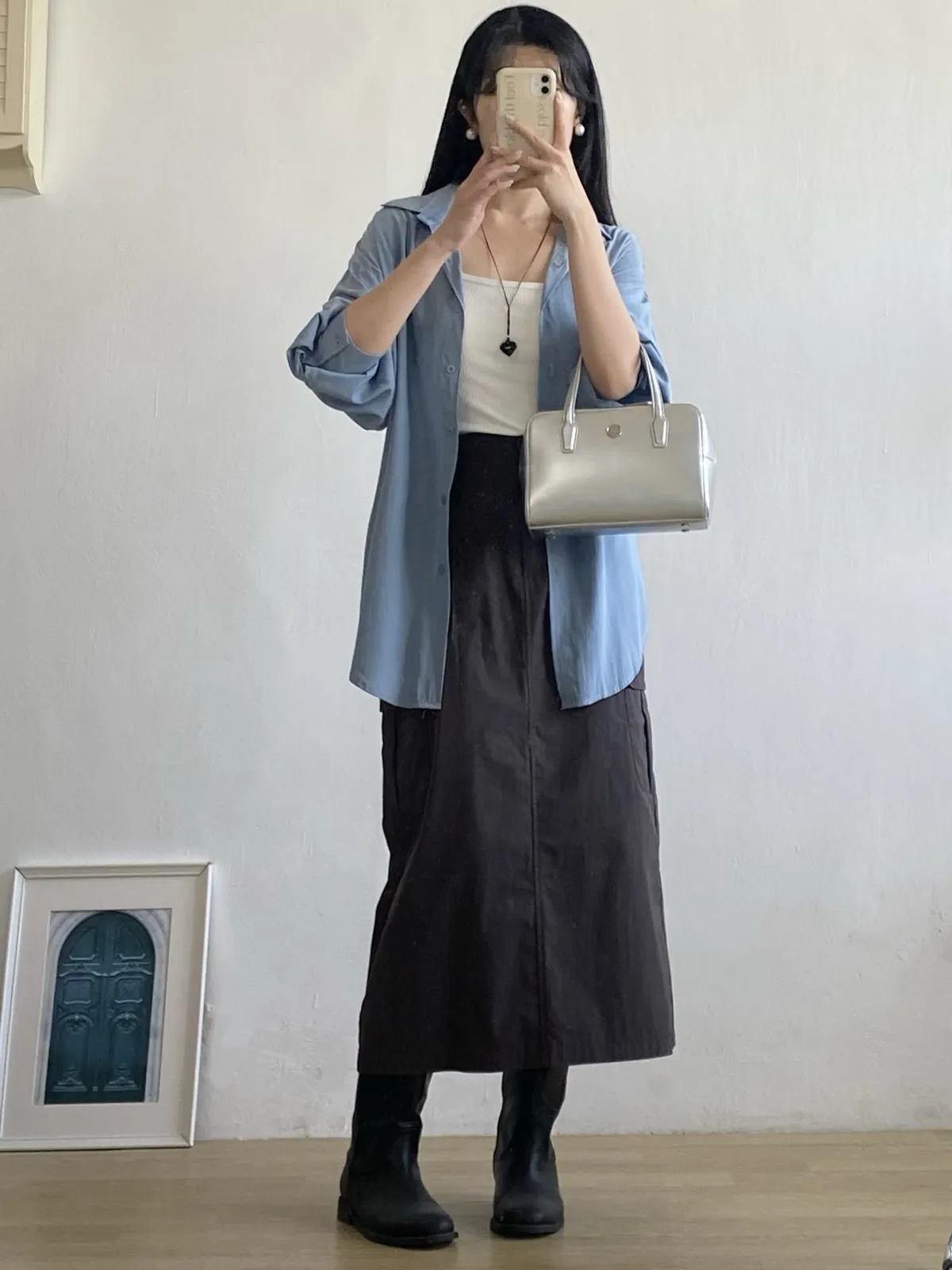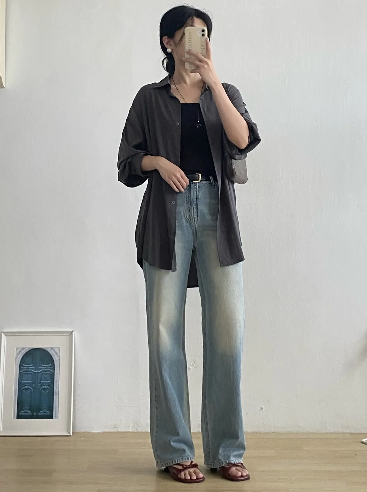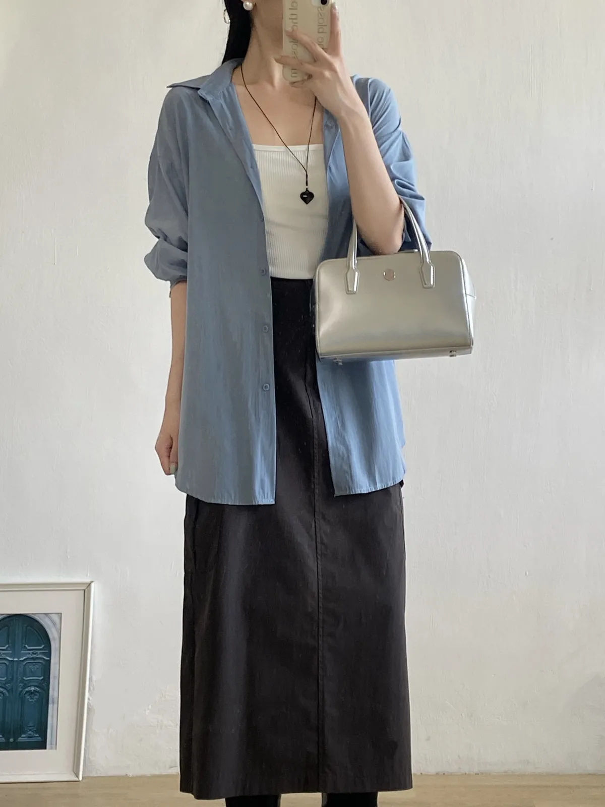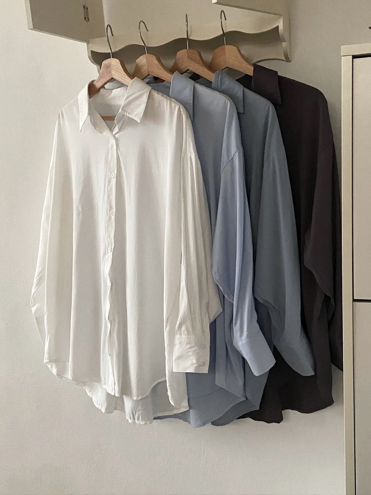 。可以當襯衫上衣、外套兩穿。柔霧藍色系🩵寬鬆版型~。光滑質料很舒服!。很適合春夏 整件輕盈柔和 有慵懶垂墜感🦦。低飽和色調看起來乾淨高級🐚。小個女孩可以當襯衫洋裝高個女孩衣長也不會過短!。長度可以遮屁股 修飾臀胯❣️------ Model 163/54腰圍68 臀圍90 大腿圍51現貨1-3天內安排寄出預購7-30天工作天(不含假日)內到貨